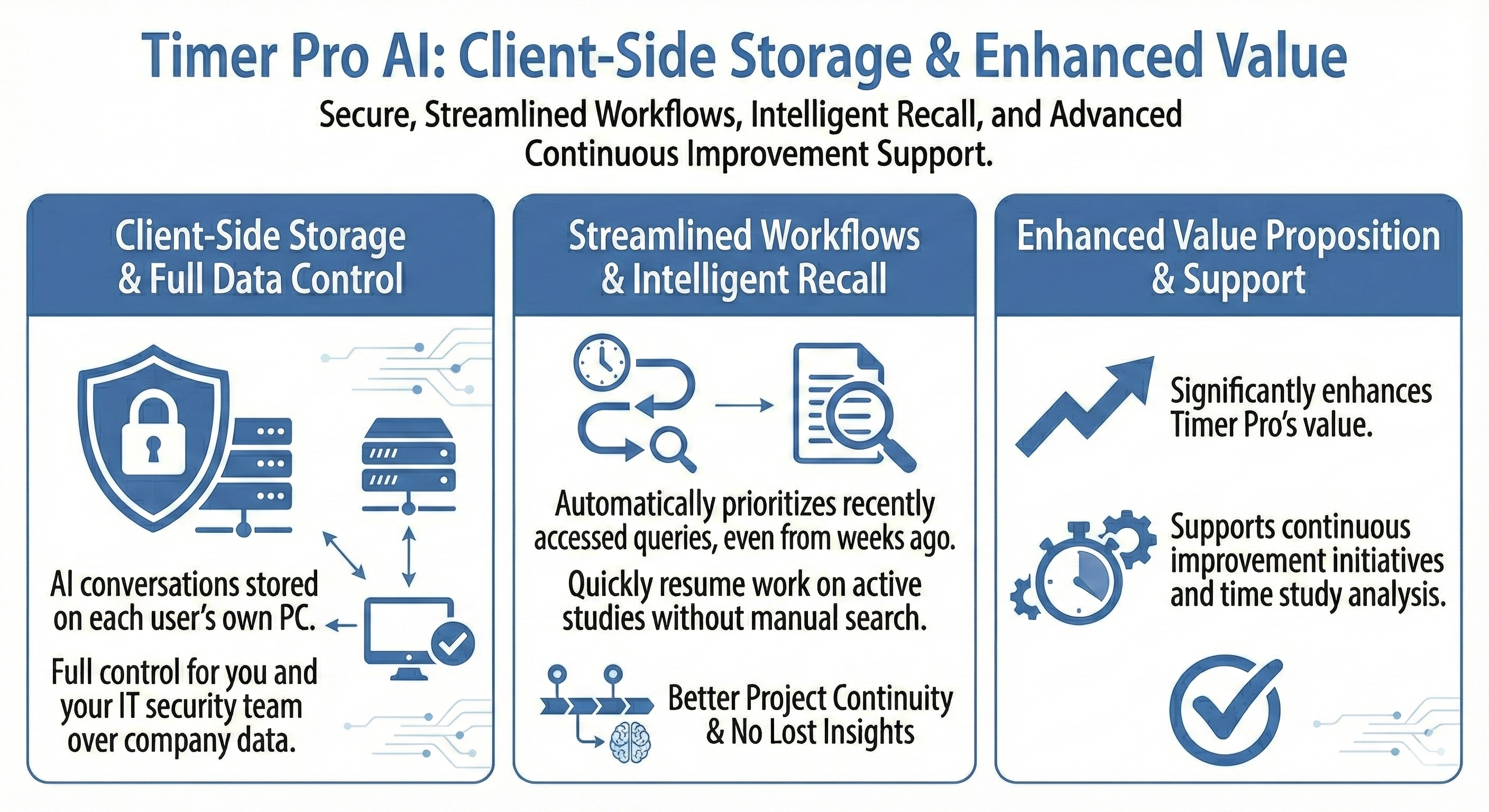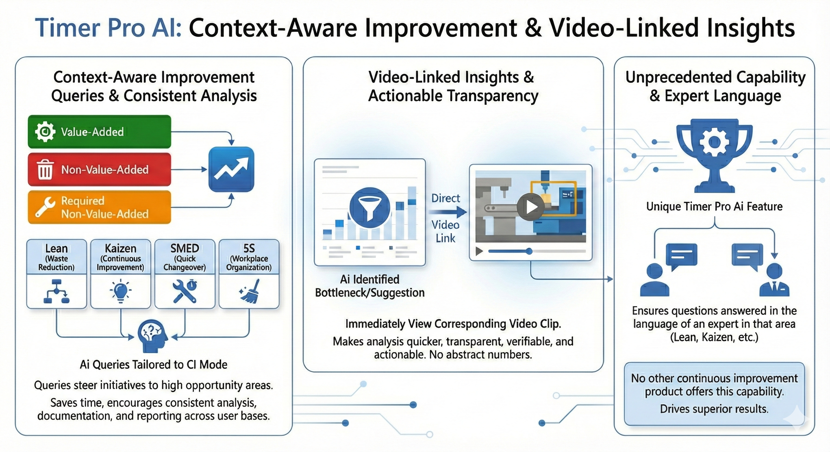 Timer Pro Ai’s advanced capabilities significantly enhance Timer Pro’s value proposition in support of continuous improvement initiatives and time study analysis.
