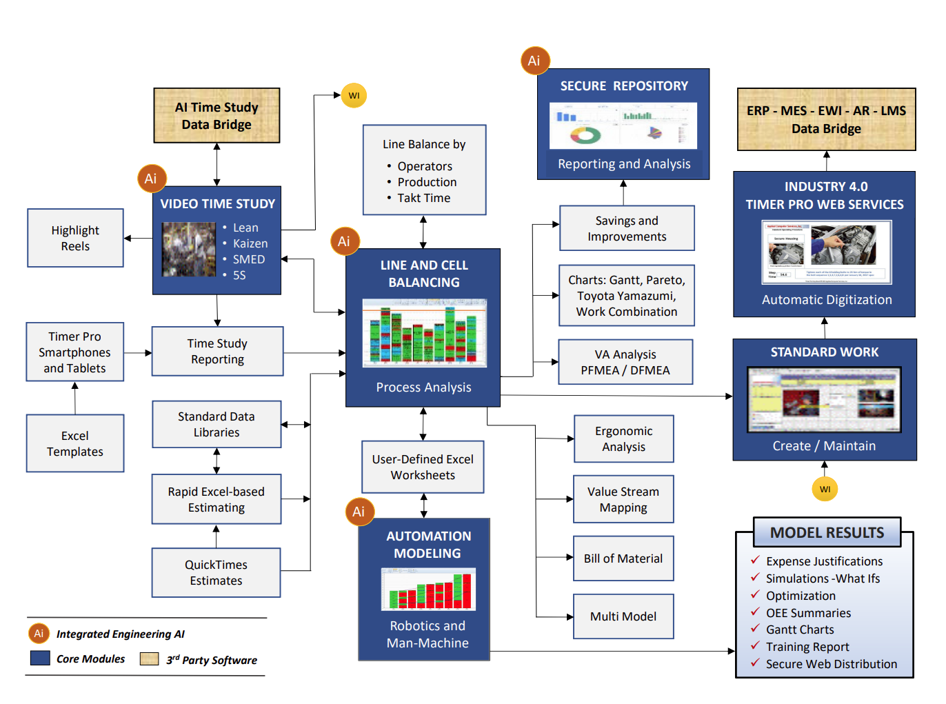 The overview flowchart below presents the Timer Pro comprehensive continuous improvement solution features and benifits. Use the website’s navigation menu to explore in detail specific capabilities. Click Free Demo Download to perform a time study, generate reports and Yamazumi charts. Request the 45-day Free Evaluation to experience the quality of Timer Pro first hand today.