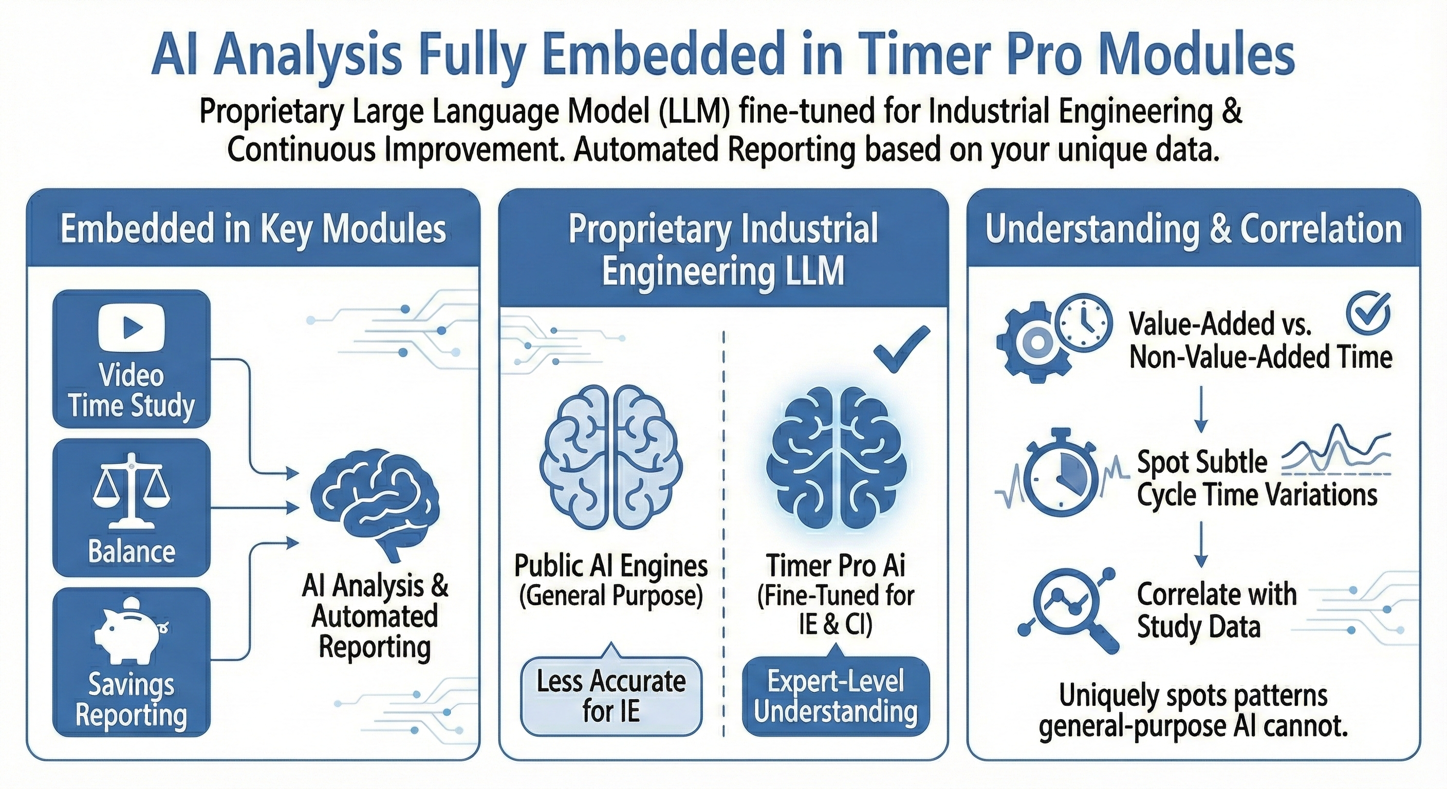 Unlike public AI engines, Timer Pro Ai is a proprietary large language model (LLM) that has been specifically adapted and fine-tuned for industrial engineering and continuous improvement professionals. Timer Pro Ai understands the difference between Value-Added and Non-Value-Added time. It can spot subtle patterns in cycle time variations and correlate them with other study data points in a way that general-purpose AI cannot.